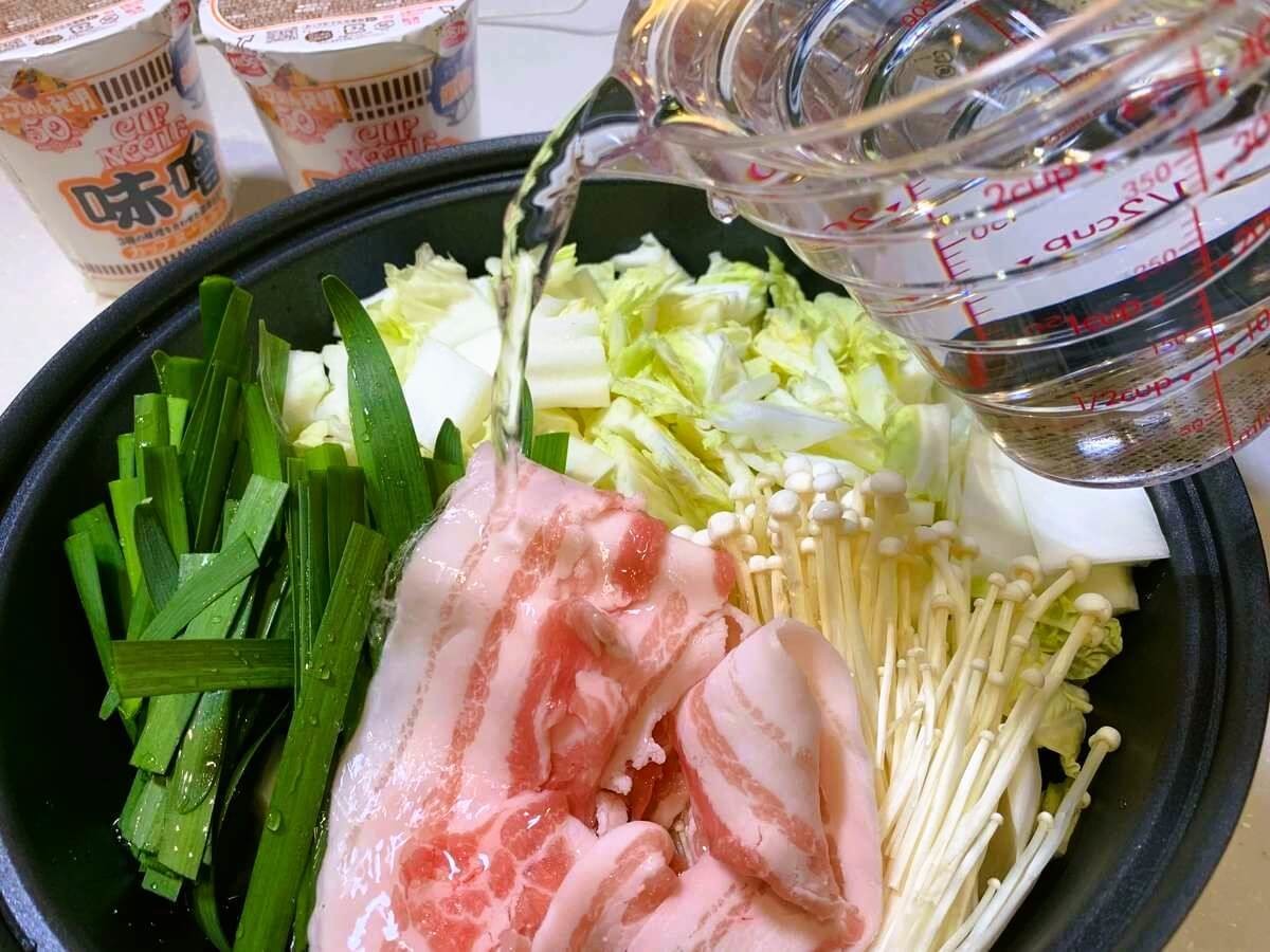 お好みの具材(今回は豚バラ肉・白菜・ニラ・えのき)を食べやすい大きさに切ってから、鍋に並べ、水(640cc)を注ぎます。