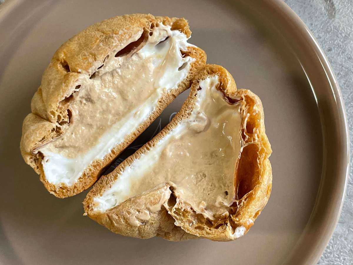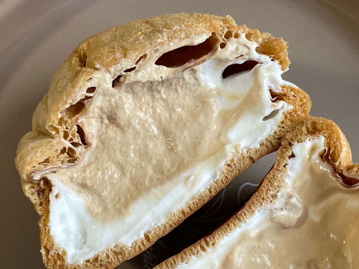 もちもちとした食感のシュー生地に、コーヒー味のホイップクリームとミルククリームの2種類が入っています。