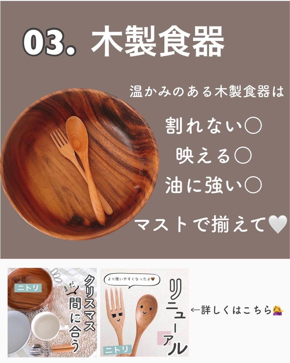 木製食器は軽くて割れにくいうえ、油にも強い!そして熱が伝わりにくいので子どもにも使わせやすいですよね。