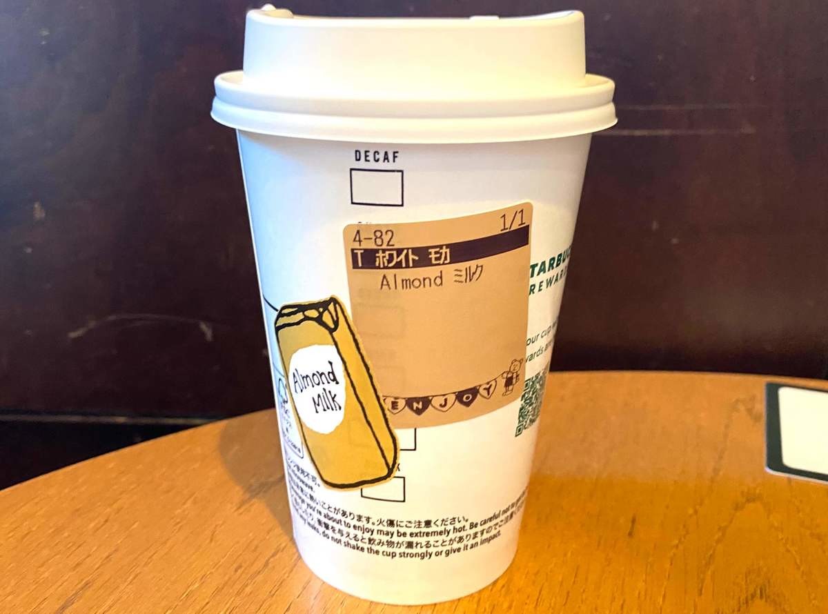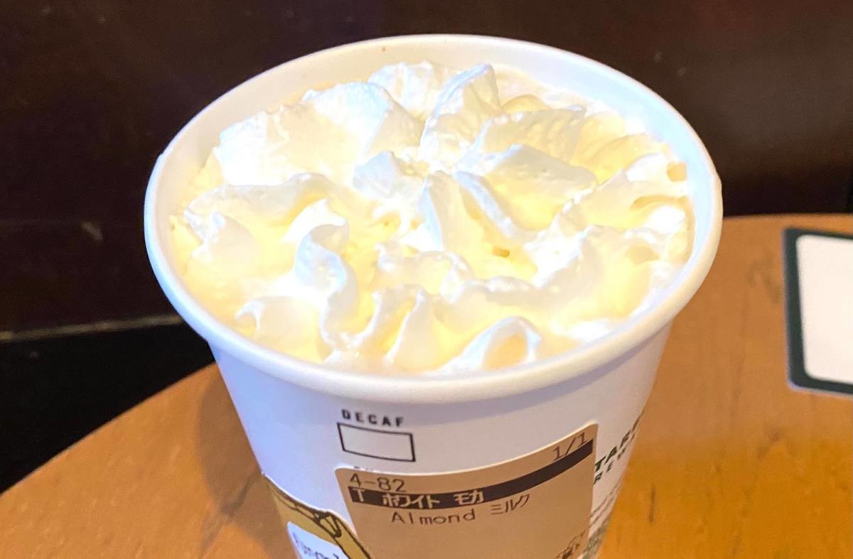 ホワイトモカをベースにミルクをアーモンドミルクに変更することで、先ほど紹介したカスタマイズドリンクとほとんど同じ味に仕上げられます。