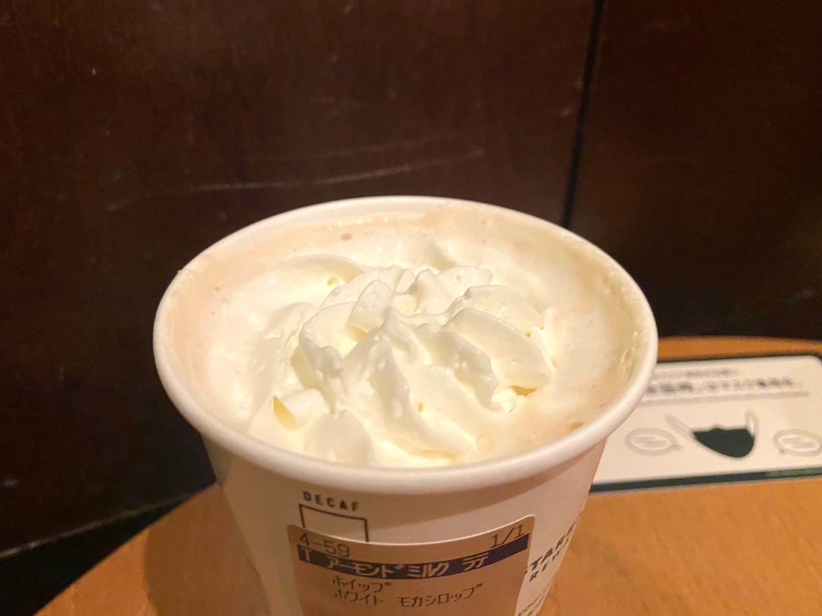 アーモンドミルクラテにホワイトモカシロップ、ホイップクリーム追加することで、モワイトモカ風味のドリンクにアレンジできます。