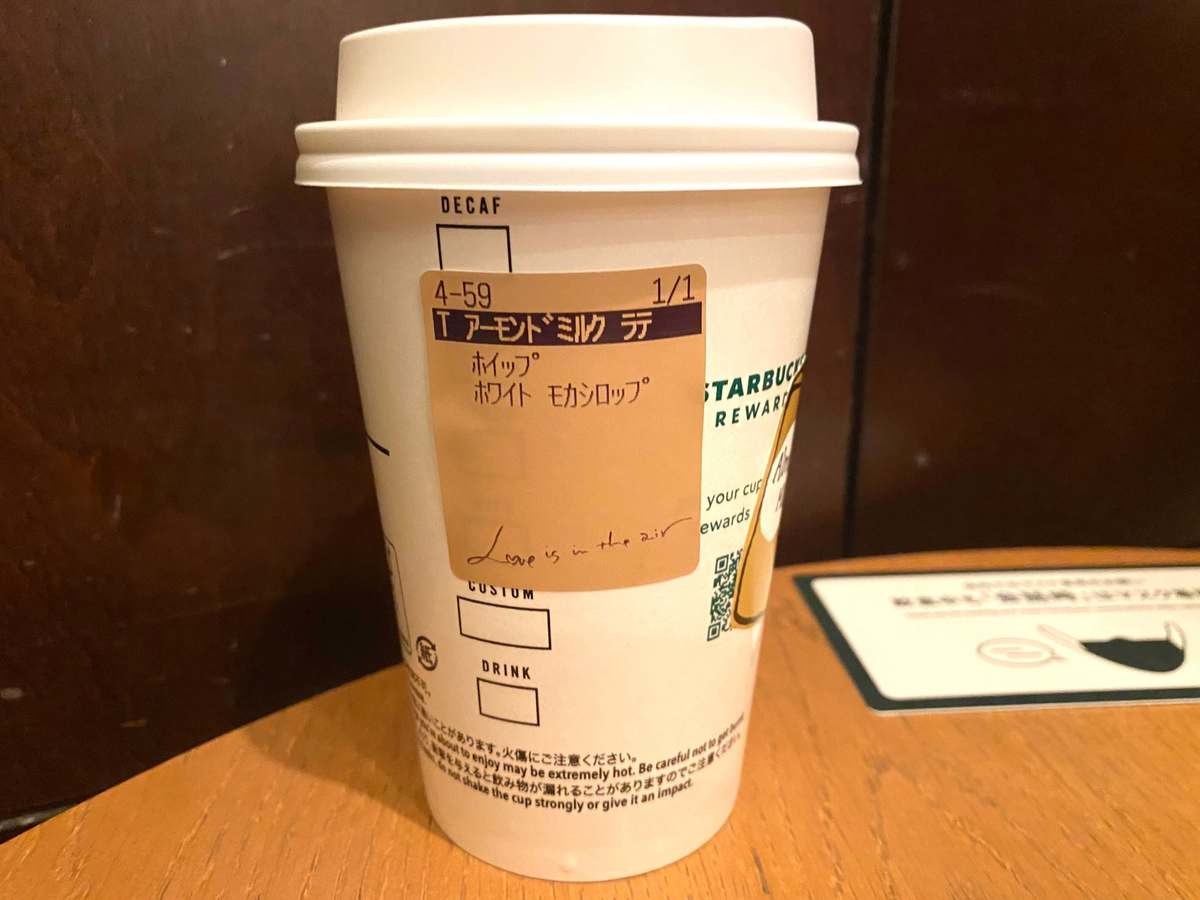 ここからは、先ほど紹介した「アーモンドミルクラテ」のホワイトモカ風味カスタマイズに、さらに無料でできるおすすめのカスタマイズを紹介します!
