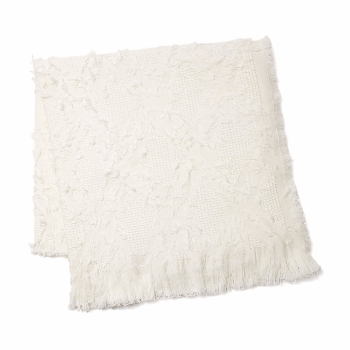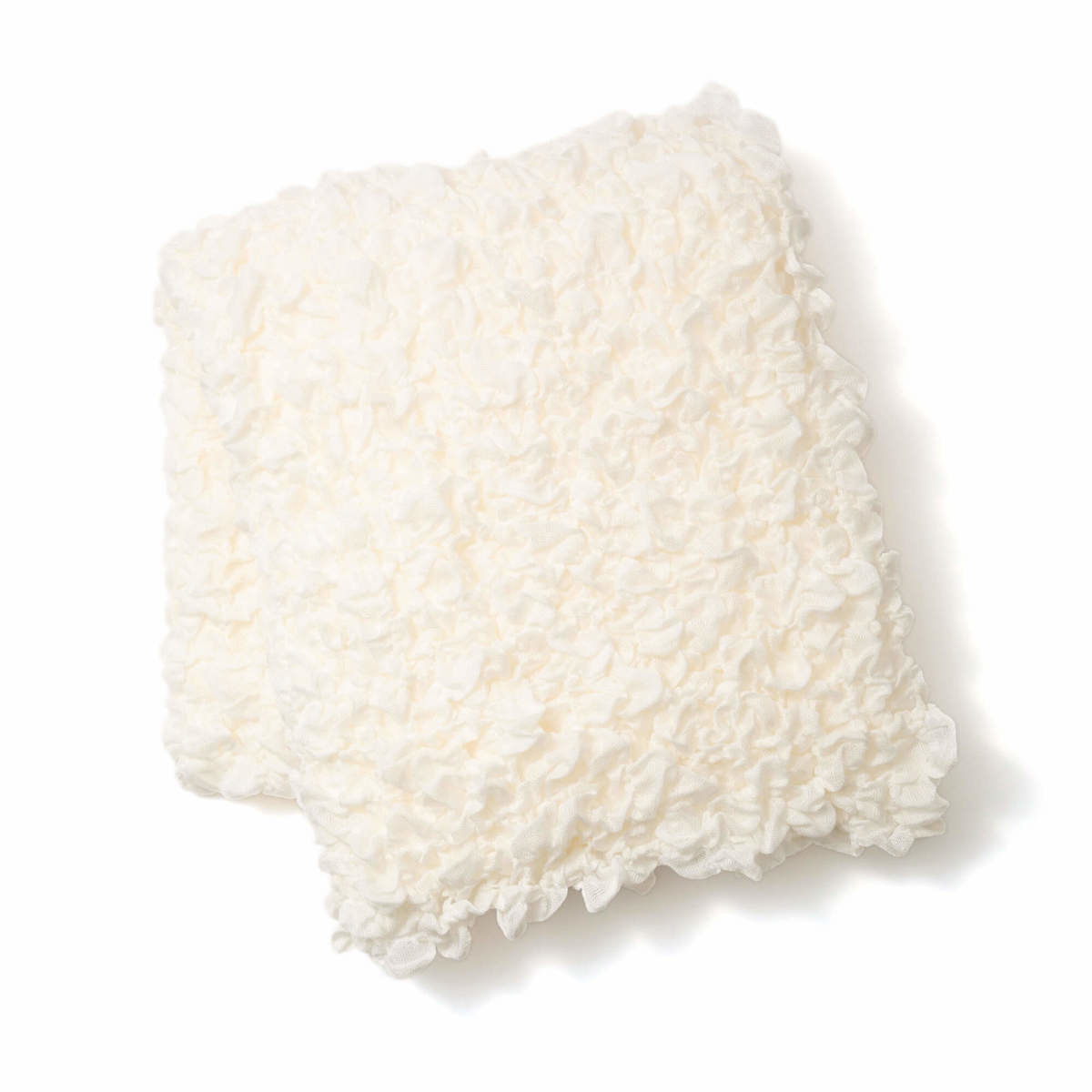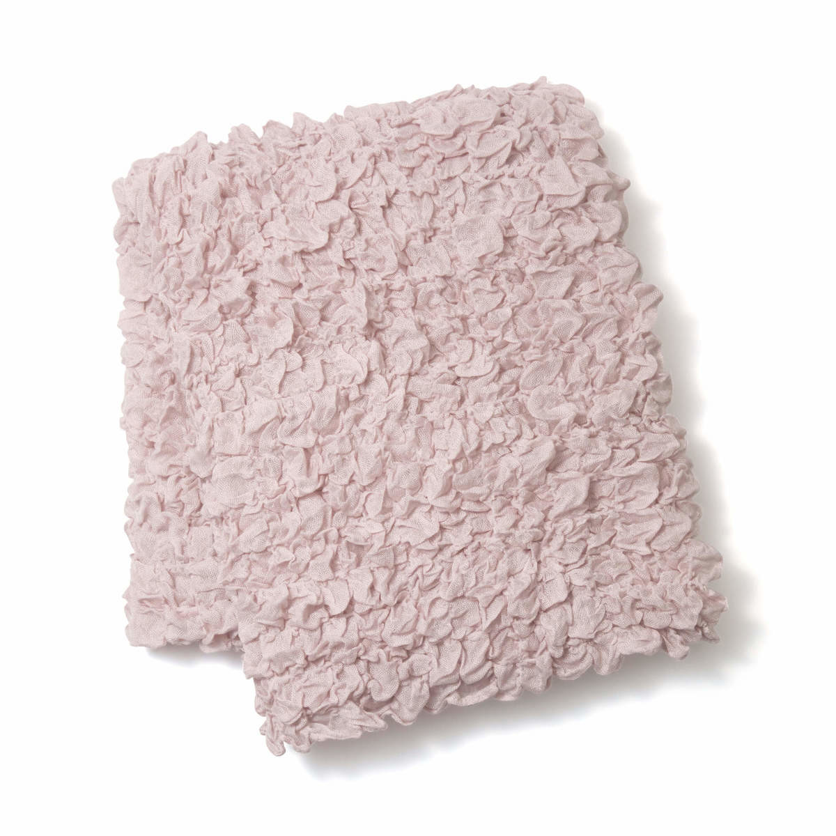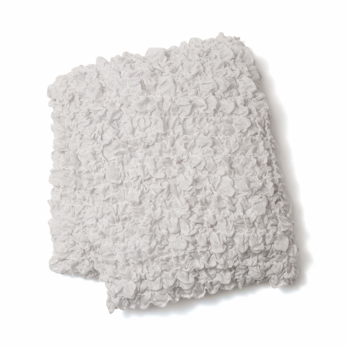 くしゅくしゅとした見た目が印象的で可愛らしいスローです。伸縮性のある糸を織り込むことによって、テクスチャーを表現しています。どんな寝具にも合わせやすいカラーリングでベッドコーディネートしやすいスローです。