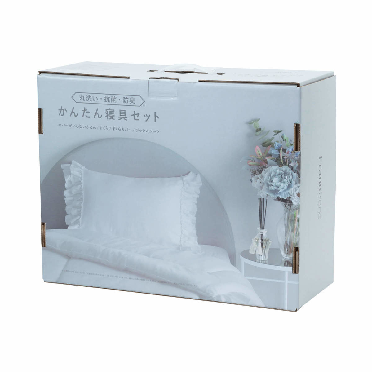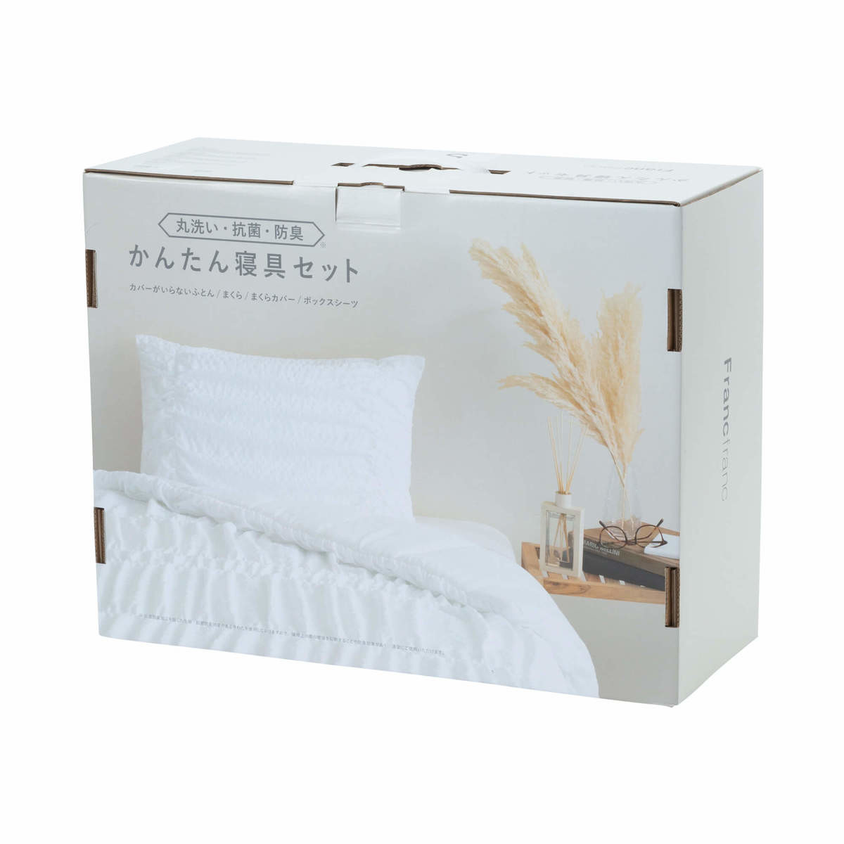まくら・まくらカバー・掛け布団・ボックスシーツの寝具4点セットです。中材と一体型の掛け布団になっていることでカバーの取り外しをする必要が無く、カバーと中材がずれるストレスがないのも嬉しいポイント。