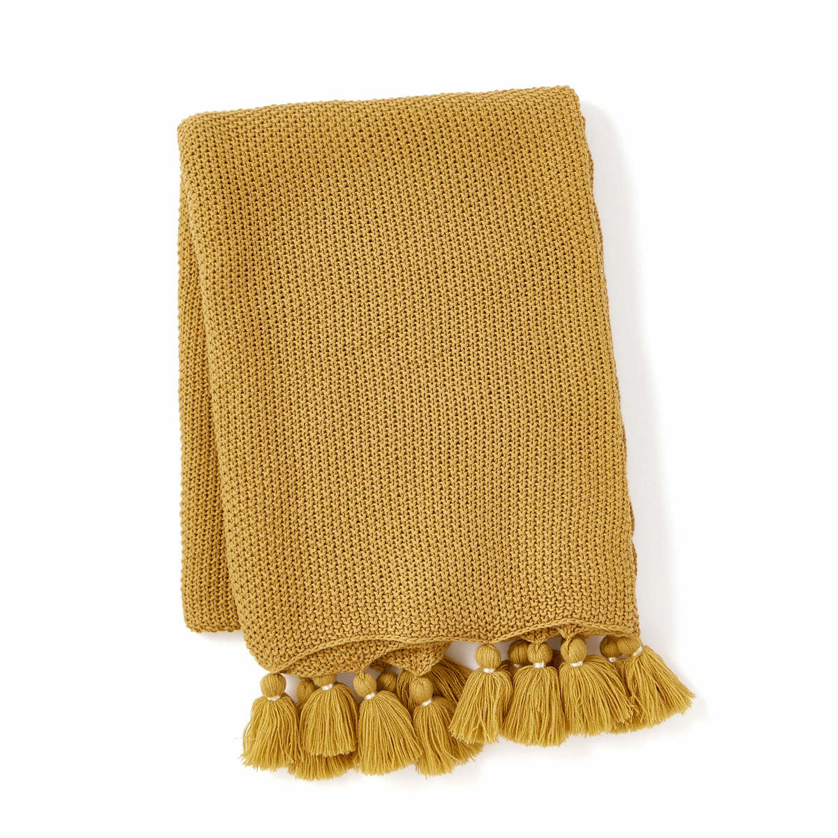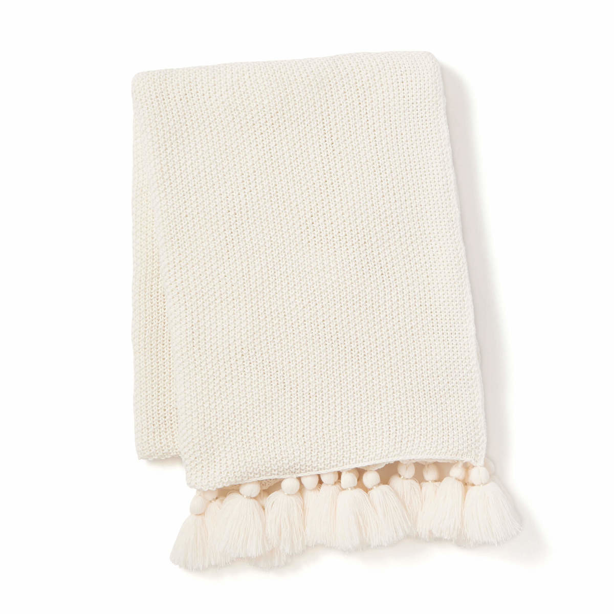 人気のコットン素材の糸を使用したシンプルなデザインのニットスローです。タッセル部分のメタリック糸がポイントです。