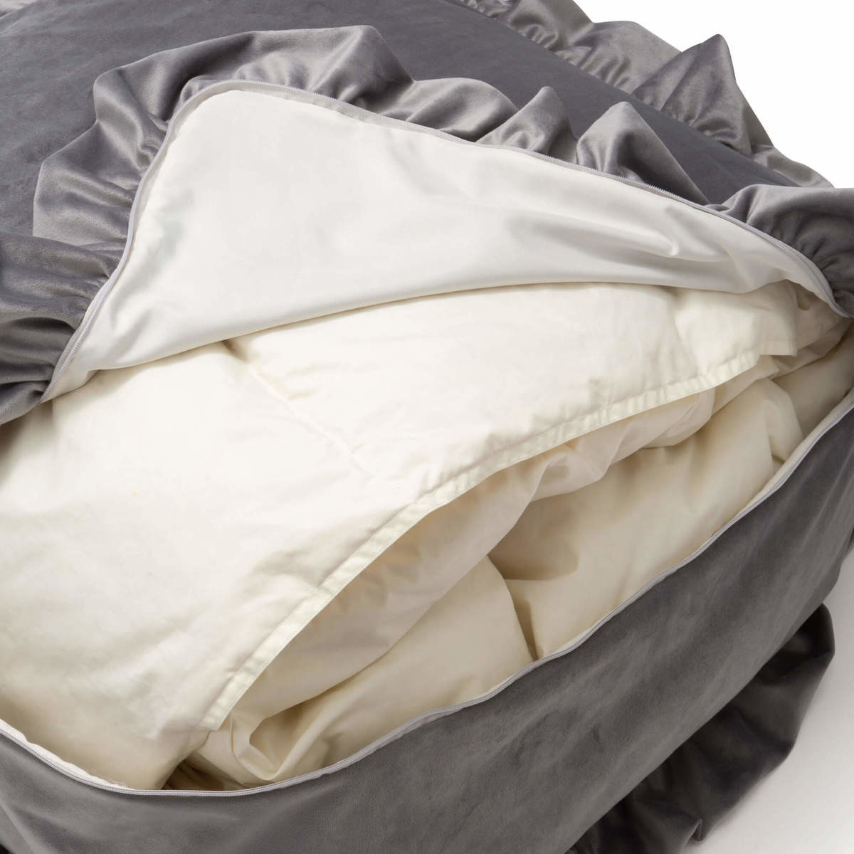 掛け布団やブランケットなどを収納し、クッションとして使える収納ケースです。水洗い可能で持ち運びやすい持ち手付き、開閉しやすいダブルファスナーなど機能性に優れています。