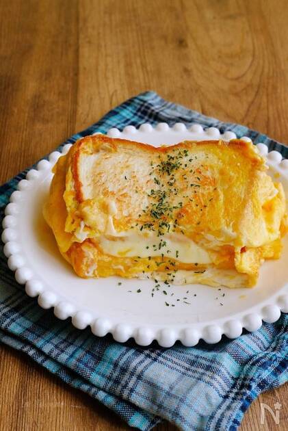 ハムととろけるチーズをサンドした、食べ応えバッチリなフレンチトーストです。ほんのり甘いフレンチトーストと、ハムとチーズの塩気が相性抜群。ハムの代わりにソーセージやベーコンでも◎。