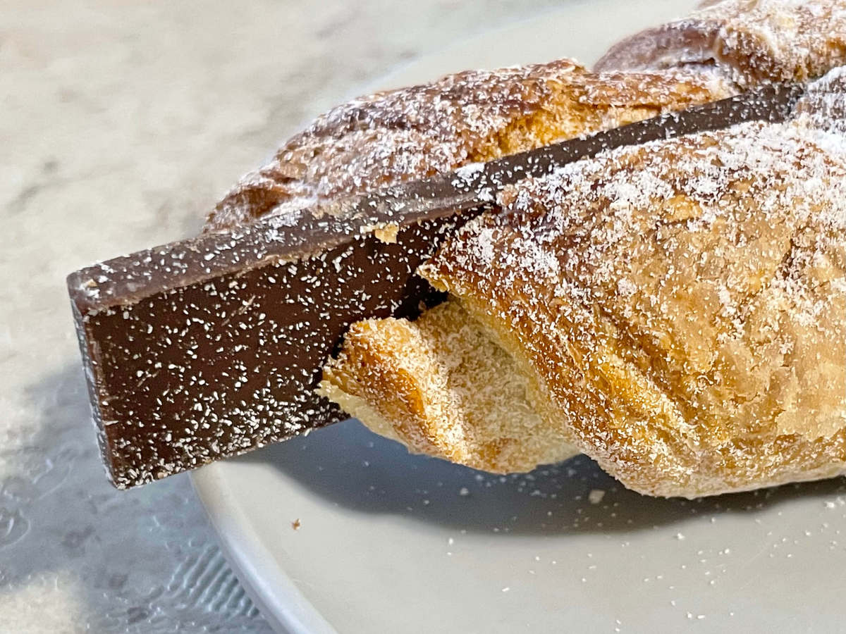 サクサクなクロワッサン生地にチョコクリームが絞ってあり、ビッグな板チョコレートが挟まれています。