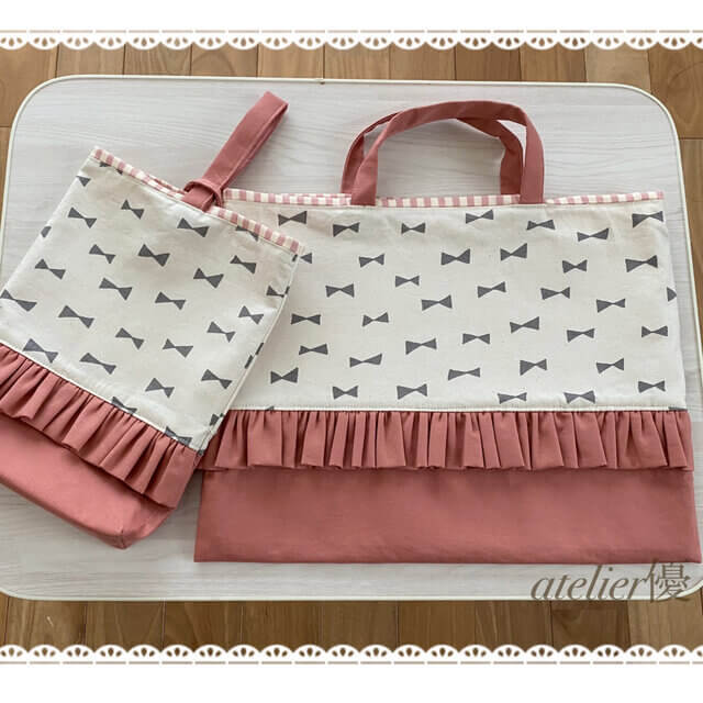 こちらの作品は、スクールバッグとシューズバッグの2点セットです。裏地もピンクとホワイトのストライプなので、バッグを開けても気分が上がりますよ。