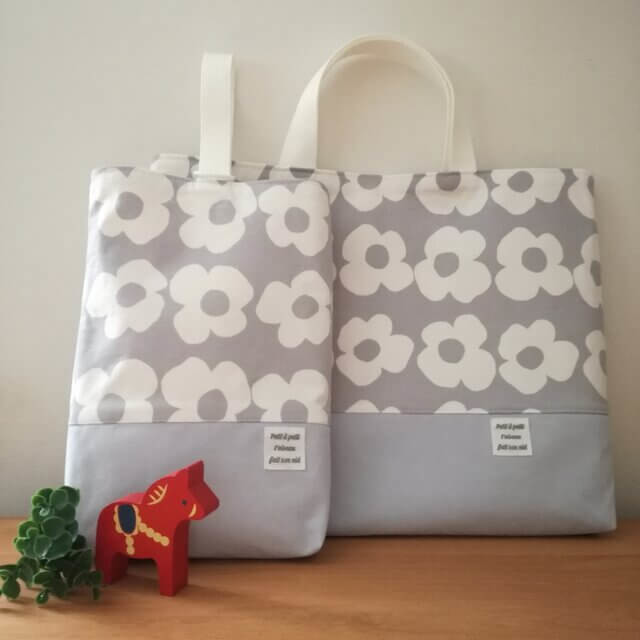透き通るようなグレー×ホワイトカラーのお花が、北欧テイストで可愛い「北欧柄入園入学2点セット」です。下部のグレーの切り替えも大人顔負けのデザインなので、高学年まで長く使えるアイテムのセットです。