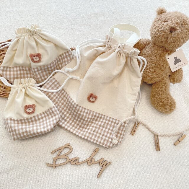 アイボリー×モフモフのくまさんが可愛すぎ!大人も欲しくなっちゃう「クマ付き巾着3点セット」です。トレンドカラーのベージュと、くどすぎないくまさんがポイント。巾着の紐をキュッと絞ると、くしゅくしゅ感がさらに可愛さをアップしてくれます。