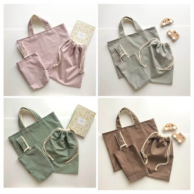 こちらの作品は、耐久性が高く丈夫な帆布を使用しています。ピンク・グリーン・ライトグレー・モカの4色から選べます。裏地をキルティングにしたり、レッスンバッグをマチ付きにしたりと、オプションも可能なのも嬉しいですね!