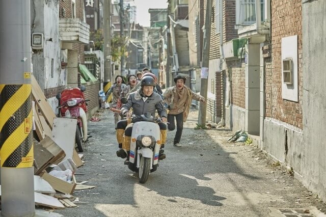 一方、オンジョの父ソジュは、市庁舎で暴れるゾンビたちにホースで立ち向かい、屋上からヘリの救援を受け、危機を乗り越えました。