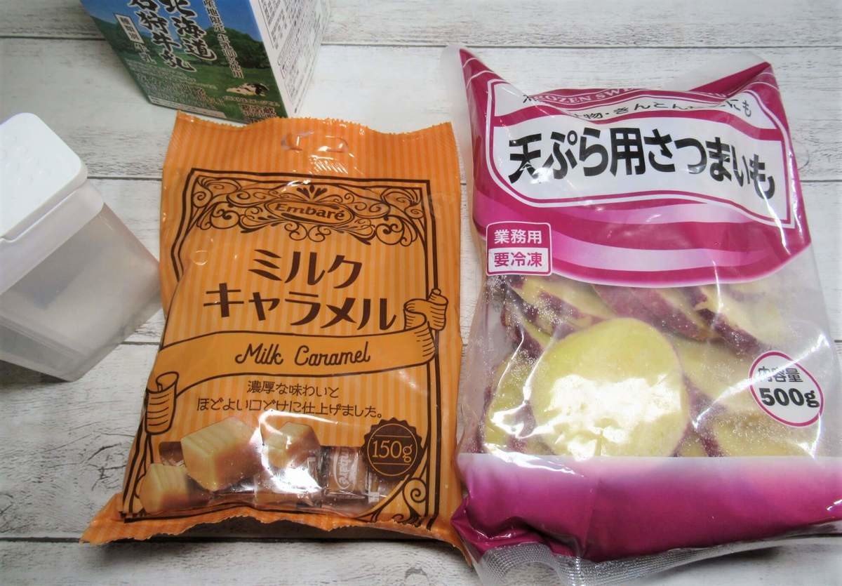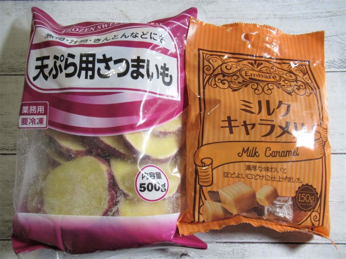 今回使用したのは、業務スーパーの便利な冷凍野菜「天ぷら用さつまいも」と、ブラジルから直輸入のミルクキャラメルです。
