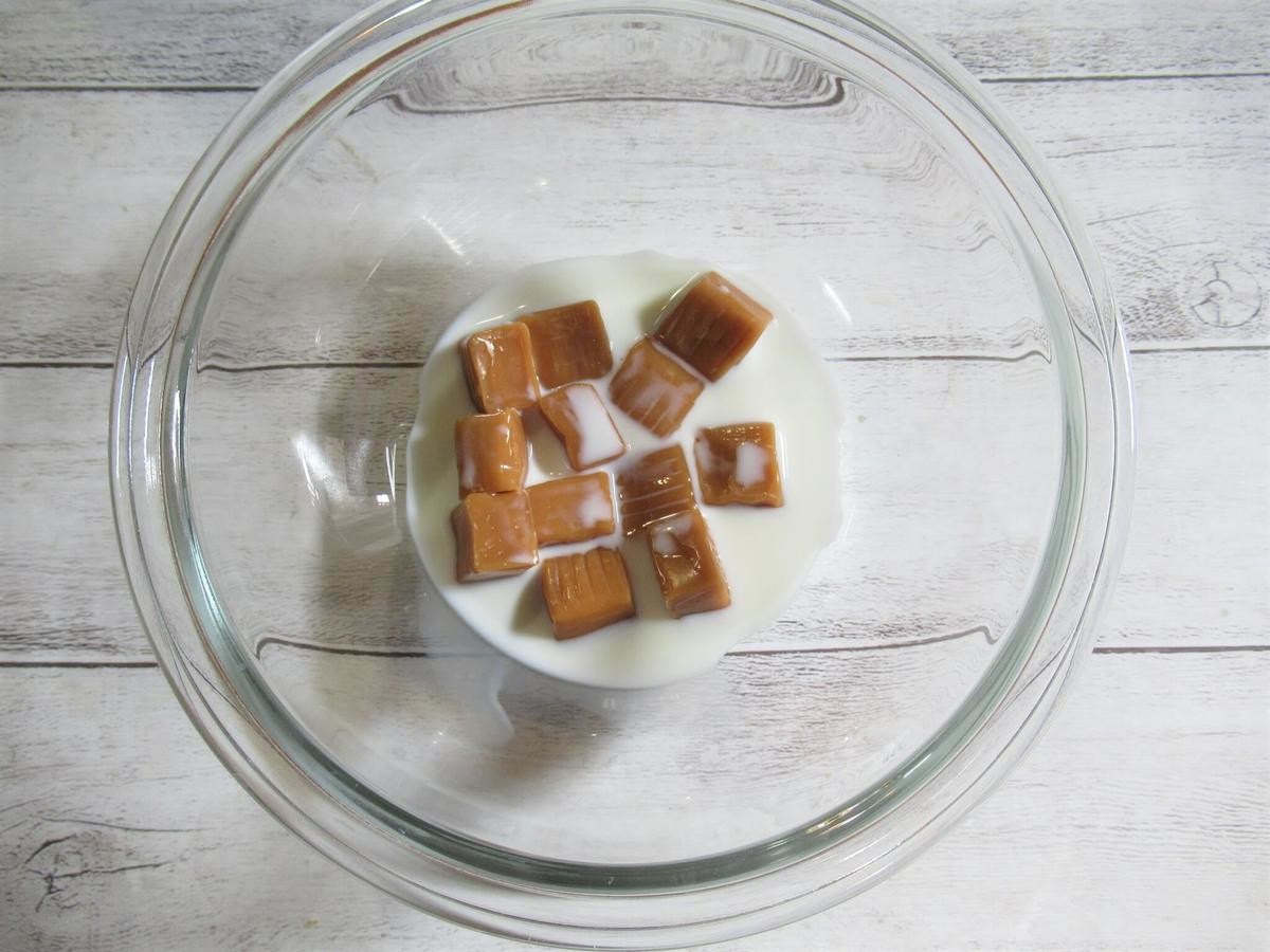 次に耐熱ボウルにキャラメル12粒と牛乳大さじ2を入れ、600Wの電子レンジで1分半~2分加熱します。