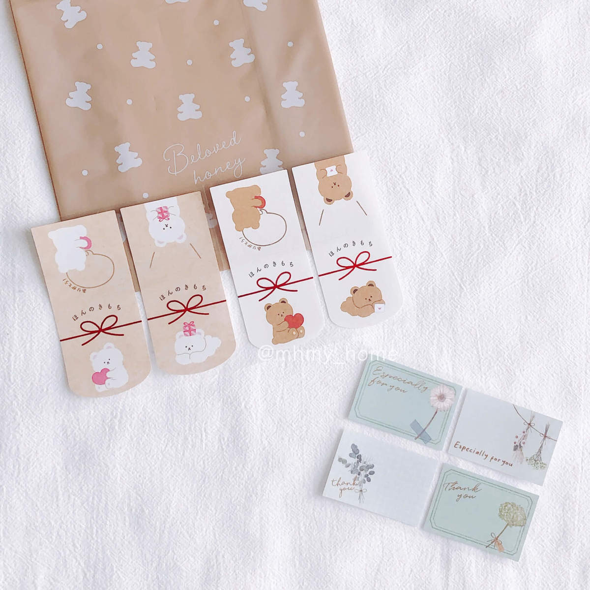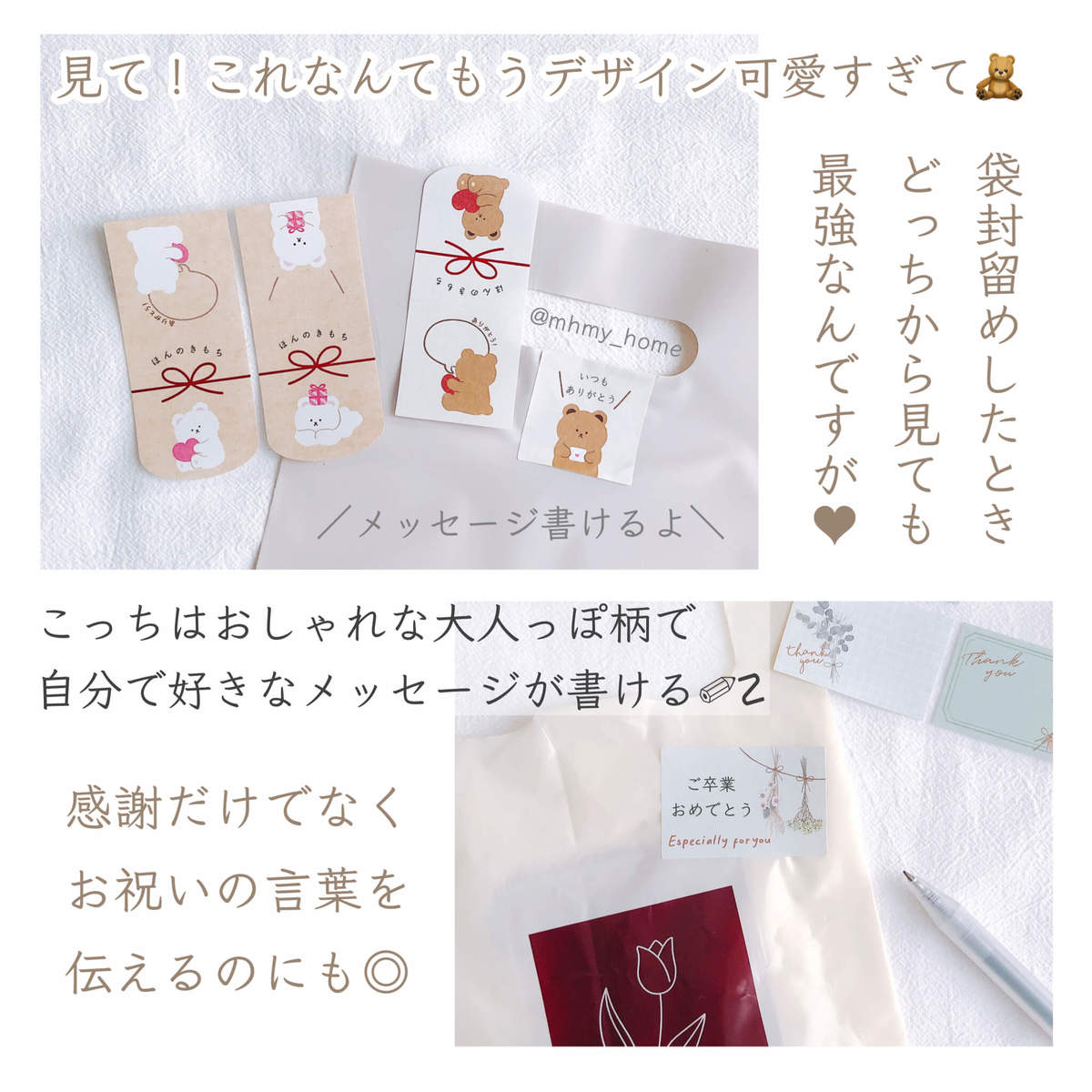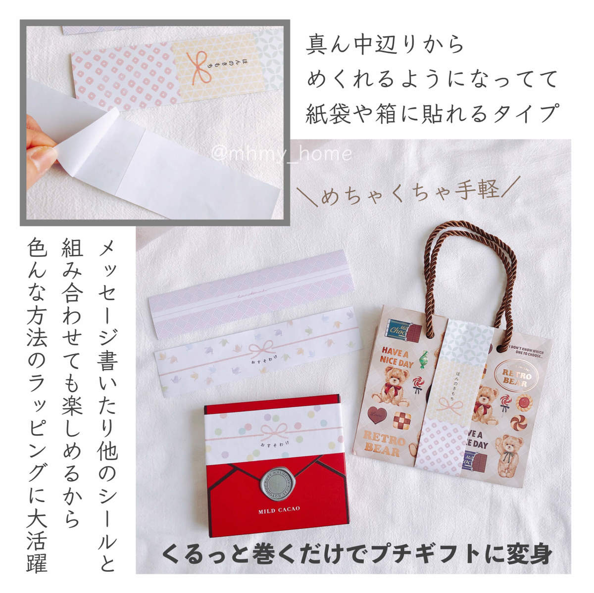 真ん中辺りからめくれるようになっていて、紙袋や箱に貼れるタイプです。メッセージを書いたり、ほかのシールと組み合わせても楽しめるので、色んな方法のラッピングに大活躍!
