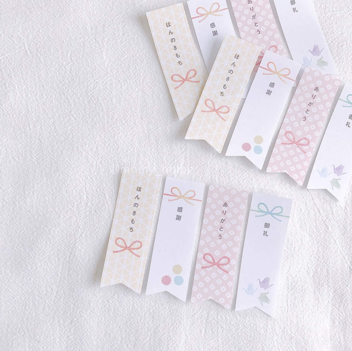それぞれたくさん入ってるのに110円(税込)。これがあれば特別なラッピングだけでなく気持ちも伝えられて便利ですね。購入した店舗では、シールコーナーではなく、ラッピングコーナーで見つけました!