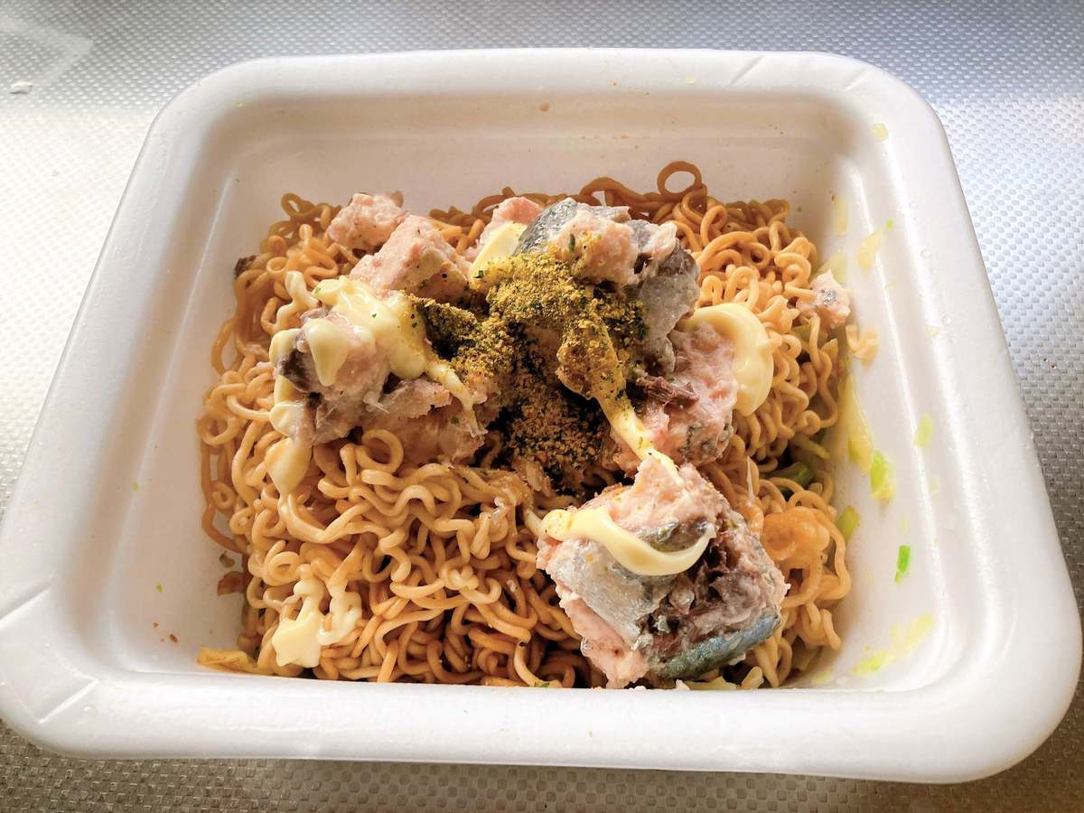 - 一平ちゃんに、サバ、付属のふりかけ・からしマヨネーズをかける。
