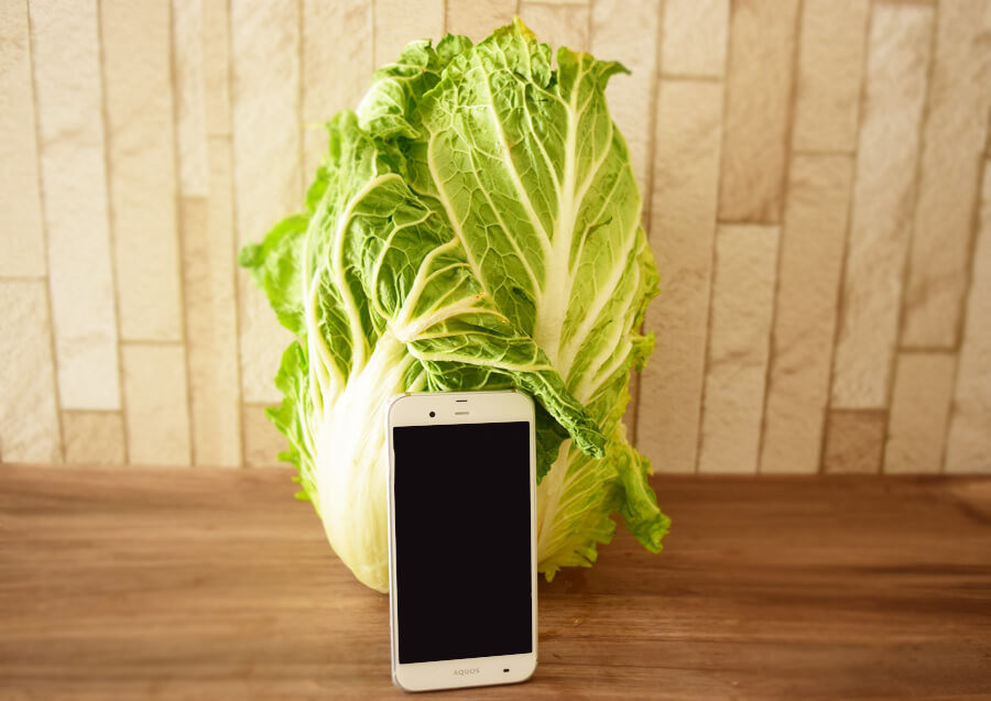 白菜の前に置いているスマートフォンの大きさは(149×73×7.6mm)です。個人的にはとんでもなく安いと思いますが、いかがでしょうか。少なくとも近隣のスーパーでこの大きさの白菜1株138円(税込)では買えません。
