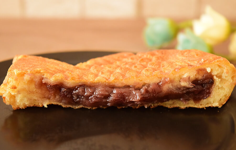 表面はカリッとして、中はホットケーキのようにふかふかで甘みがあります。あんこはドロドロにみえますが、一応つぶあん。