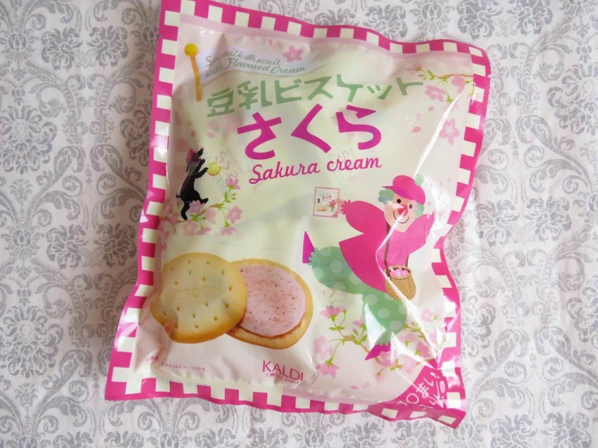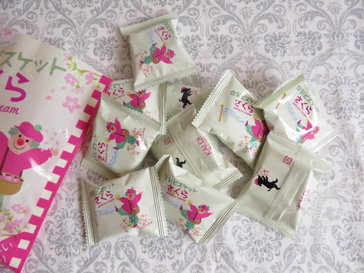 言わずと知れたカルディの人気お菓子「豆乳サンドビスケット」のさくら味。花咲かじいさんになったピエロのイラストが目印です。