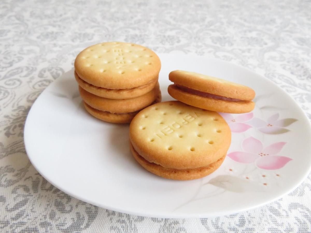 豆乳入りのビスケットは、サクッとした心地よい歯ごたえ。ビスケットだけでもおいしいのに、さくらクリームがサンドされてリッチな仕上がりです。
