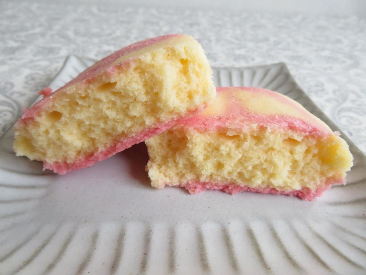 ピンク色が桜あん。ぐるぐると巻き込まれ、ほのかな塩気と甘いあんが楽しめます。