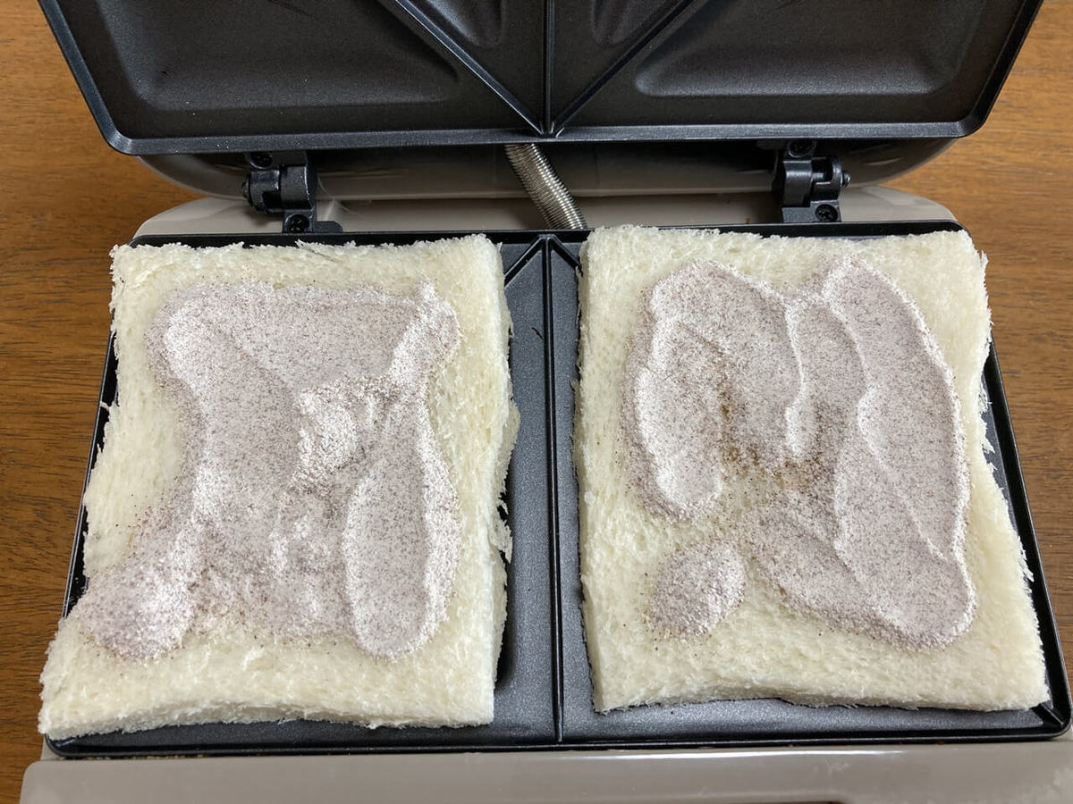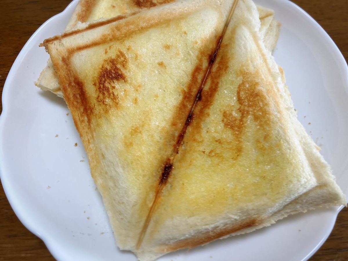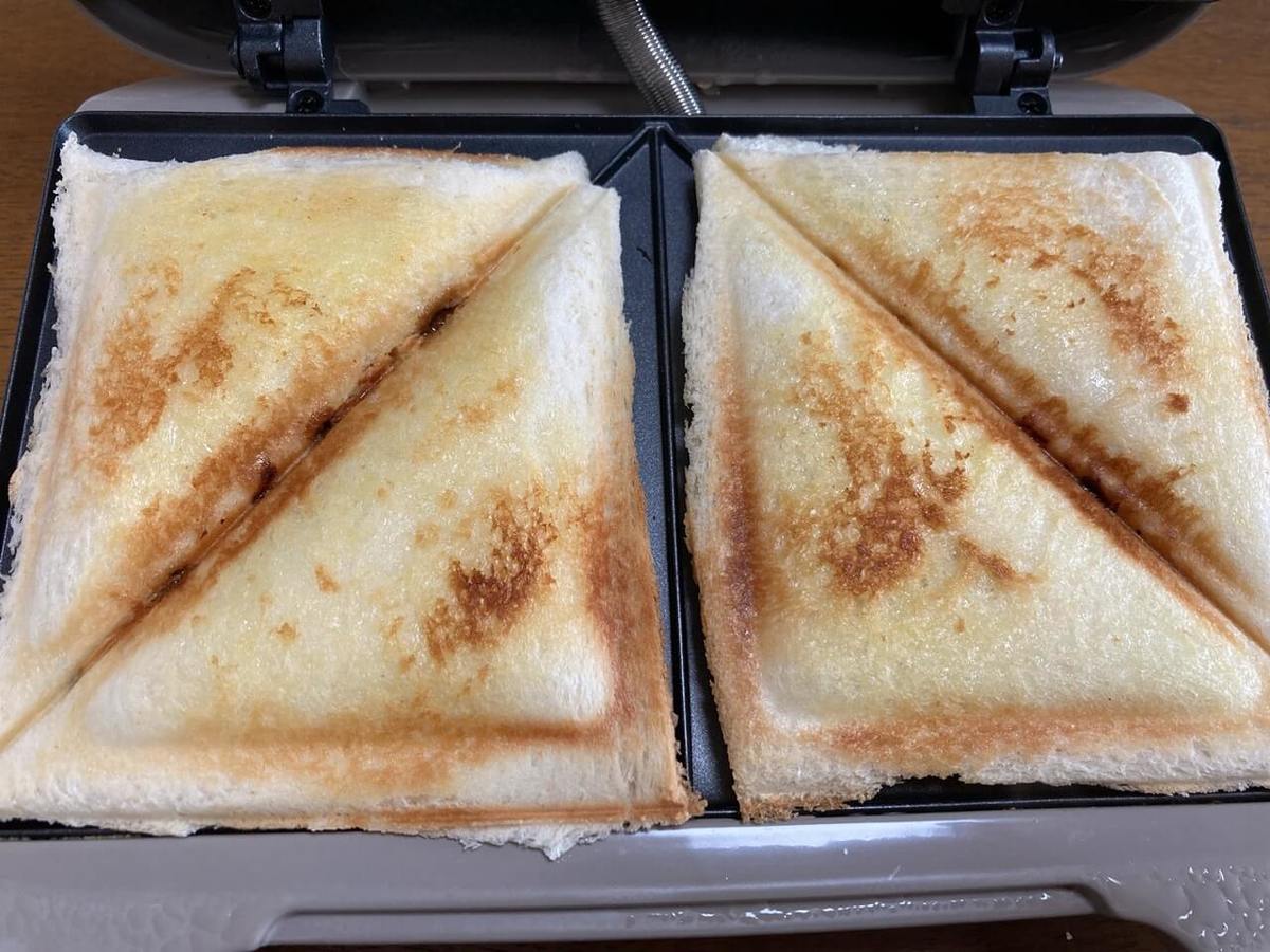 うちのホットサンドメーカーは両面焼きなので1分半~2分の加熱でちょうどいい焼き目になりました。