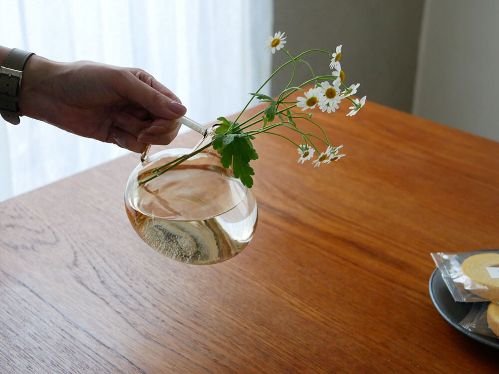 この「ライトリー GLASSフラワーベース」もそんな花瓶。 ガラスのみずみずしさ、柔らかなフォルム、奥行きのある色合いで、オブジェのように飾る場所を引き立ててくれます。