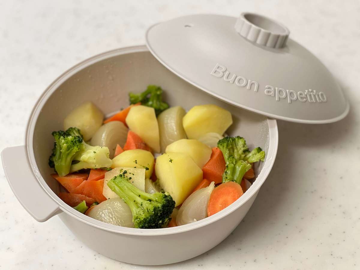 ビストロヌードル本体にすのこをセットします。一口大に切った野菜をなるべく平らになるように並べ(火の通りにくいものは下に、葉物は上に重ねます)、さっと水をかけます(20ccくらい)。蓋をして電子レンジで5〜6分ほど温めるだけで、野菜たっぷりの温野菜の完成です。わざわざ分量を計らずに作れるので、とっても簡単ですよ♪
