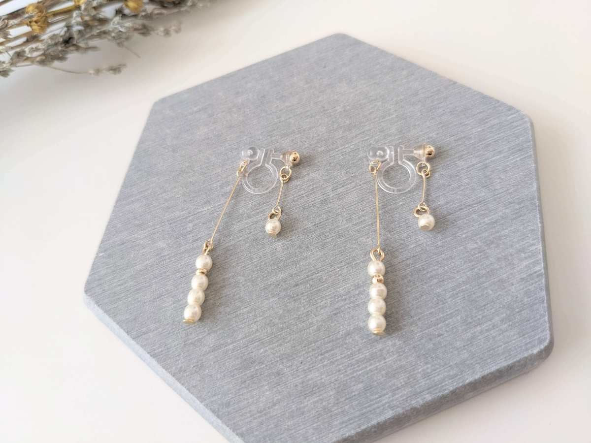 はじめに紹介するのは、こちらの「バックデザインパール樹脂イヤリング」。 小粒パールがあしらわれた控えめなデザインが好ポイントです♪