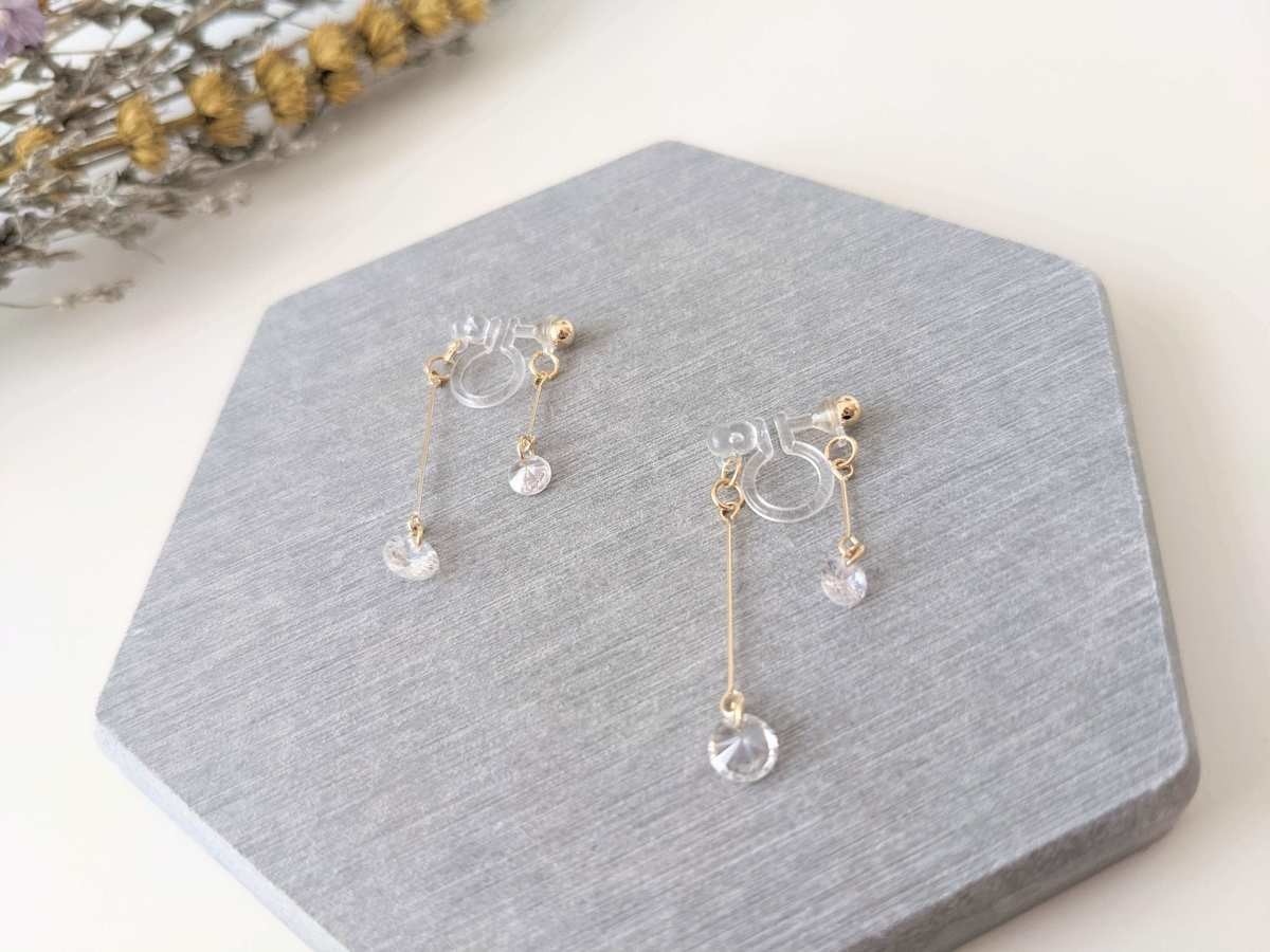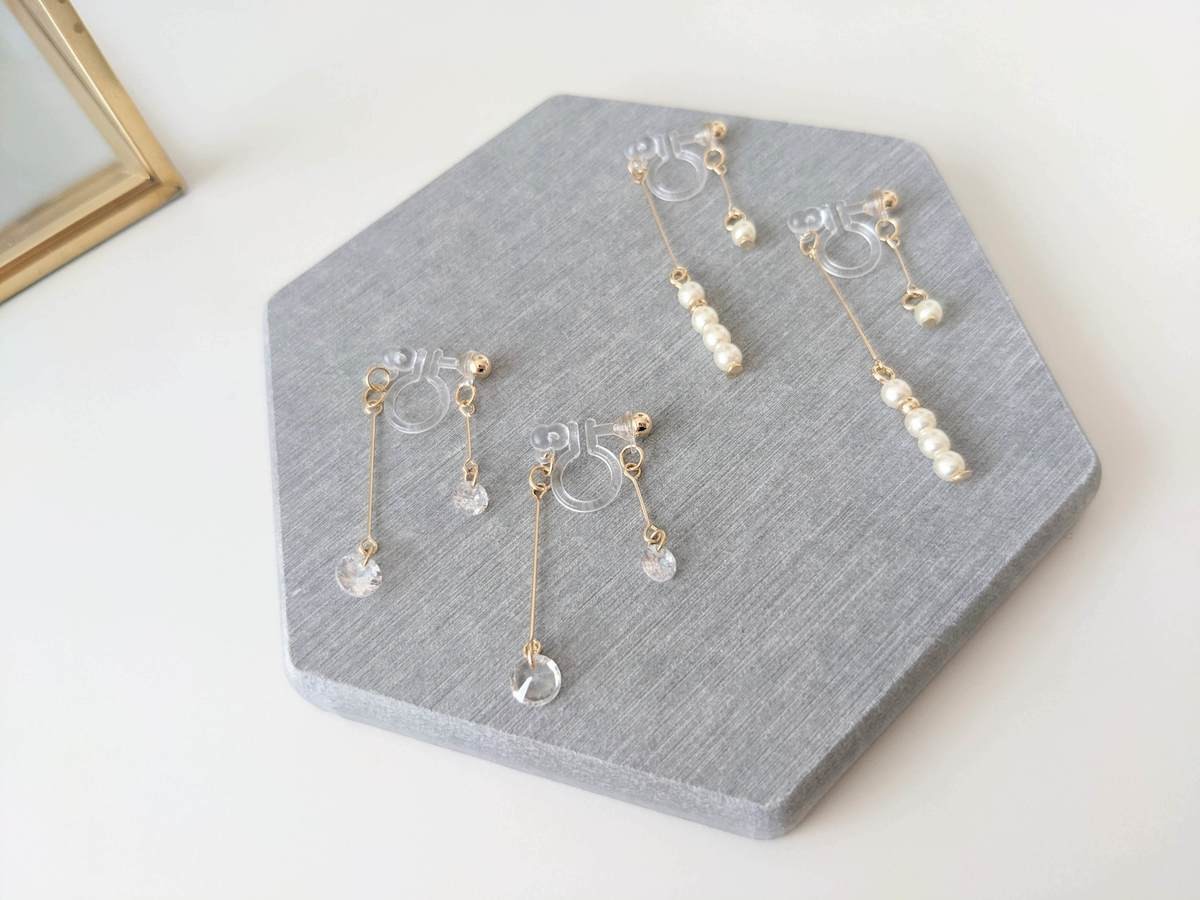 続いて紹介するのは、「バックデザインキュービック樹脂イヤリング」です。 こちらも控えめではあるものの、先ほどのイヤリングと比べると、よりきらびやかな印象を与えてくれます。