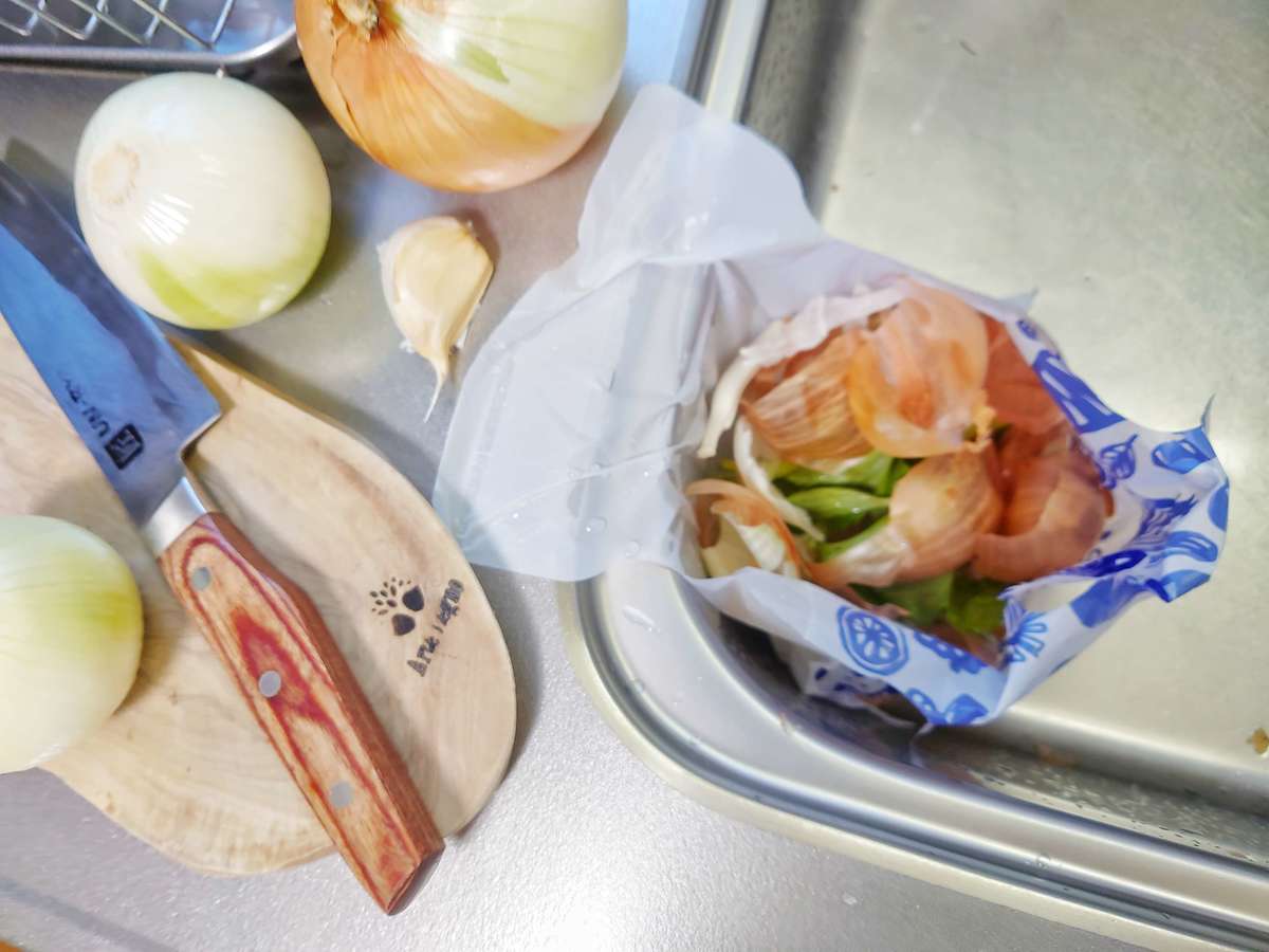 このようにまな板の近くにゴミ袋を貼れば、切りながら出た生ゴミも捨てやすくなります。