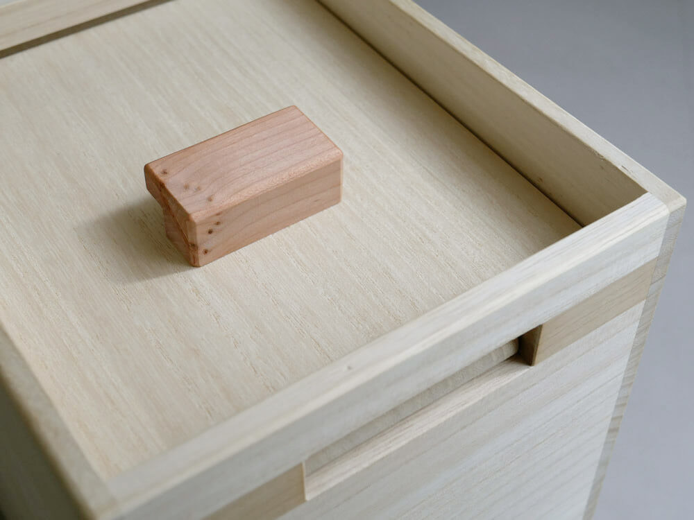 この「キャスター付き米櫃」のモデルとなる桐箱はもともと茶道の箱として抹茶茶碗などを入れる上等な箱。 なのでどこから眺めても美しく、整った姿はまさに芸術品そのもの。