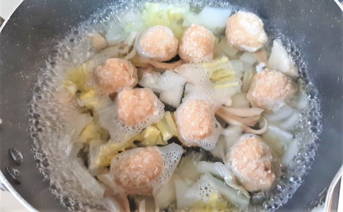 こちら、何の変哲もない野菜スープ。そこに凍ったままの肉だんごを入れちゃいました。