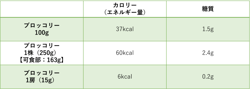 ブロッコリー100gあたりと1株(250g)あたり、1房(15g)あたりのカロリー(エネルギー量)と糖質の量はそれぞれ以下の通りです。