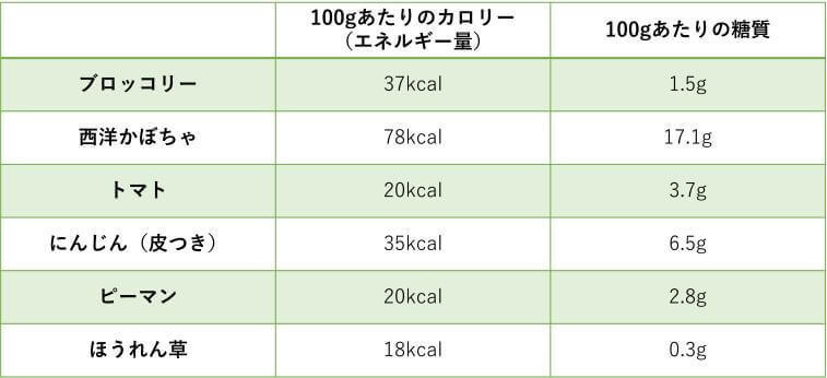 ブロッコリーのカロリーと糖質の量を、ほかの緑黄色野菜100gあたりの量と比較したものが以下の表です。
