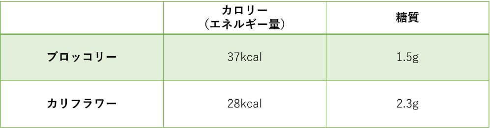 形が似ていることから、ブロッコリーと比較されることの多いカリフラワー。100gあたりのカロリー、糖質の量を比較すると以下のようになります。
