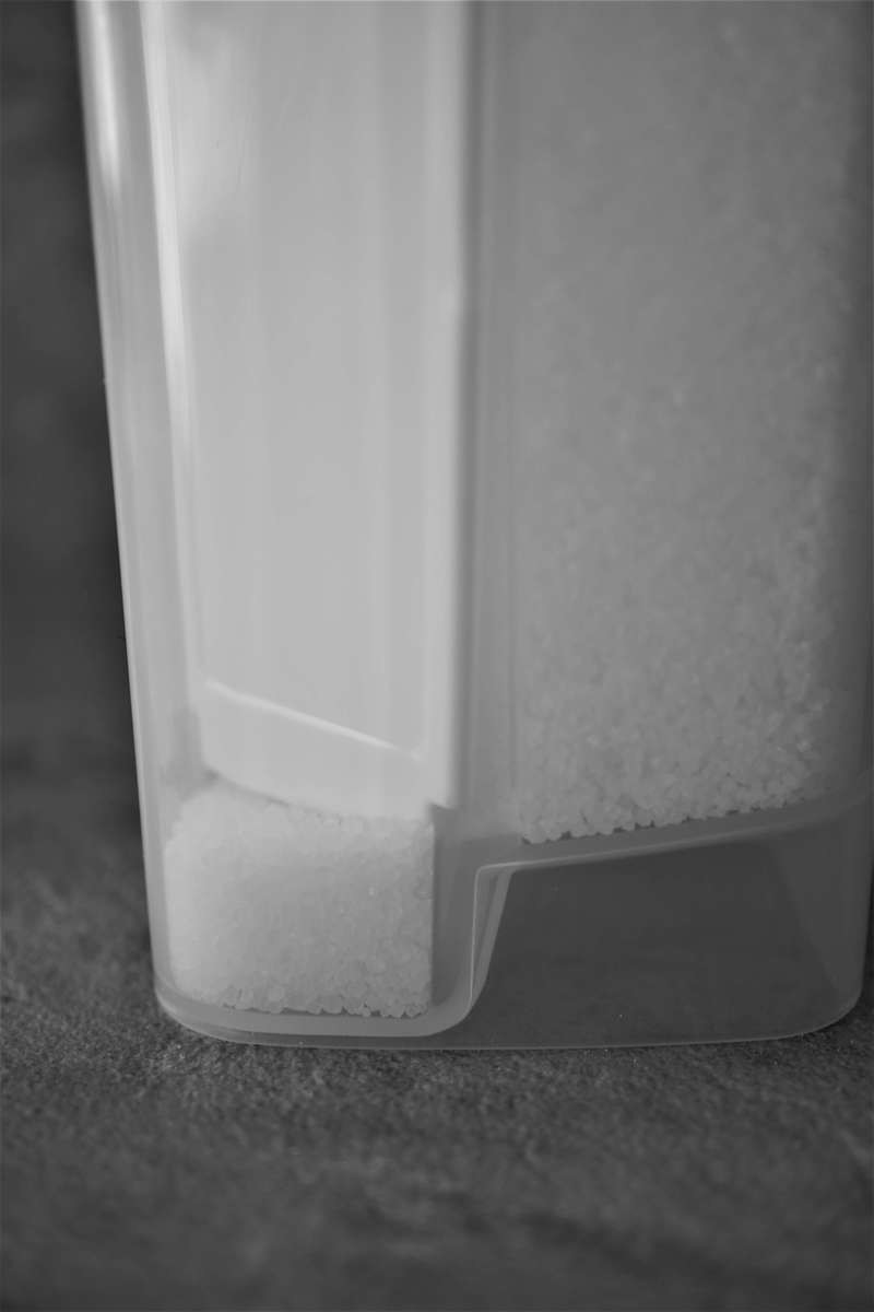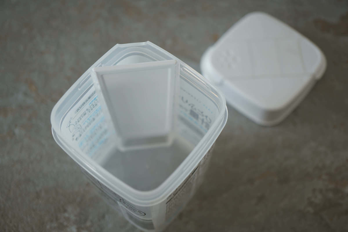 仕切り板がある側の底に粉末洗剤がたまります。洗剤を出した後ボトルをもとに戻すと自動的にまた洗剤がたまります。