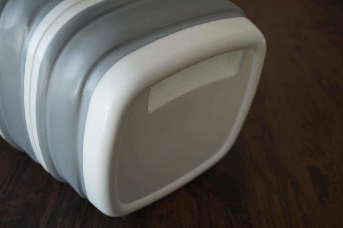 本体のグレーの部分は折りたたみ部分になるため素材は柔らかいのですが、中央の2段の白い部分は固くしっかりした素材が使われているため強度があり安心です。