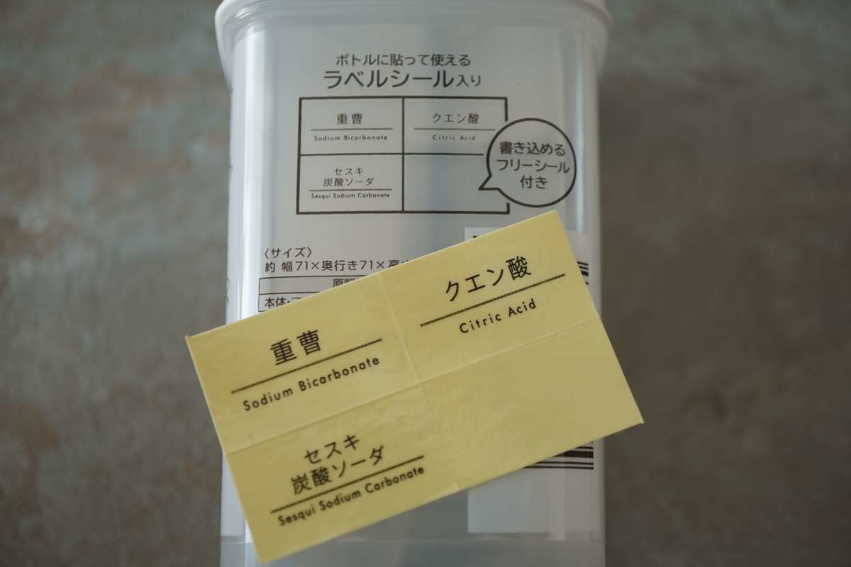 右下は書き込めるシールになっているので重曹・クエン酸・セスキ炭酸ソーダ以外の洗剤を入れる場合は手書きラベルを作ることができます。