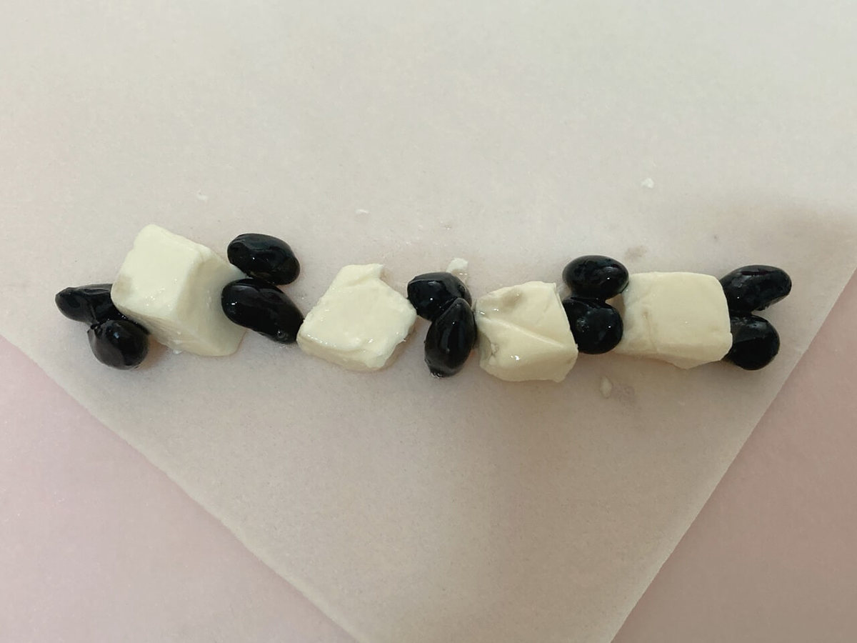 ①春巻きの皮の上に黒豆(適量)サイコロ状に切ったクリームチーズ(適量)を交互にのせ、周りに水溶き粉(適量)を塗り巻いていく