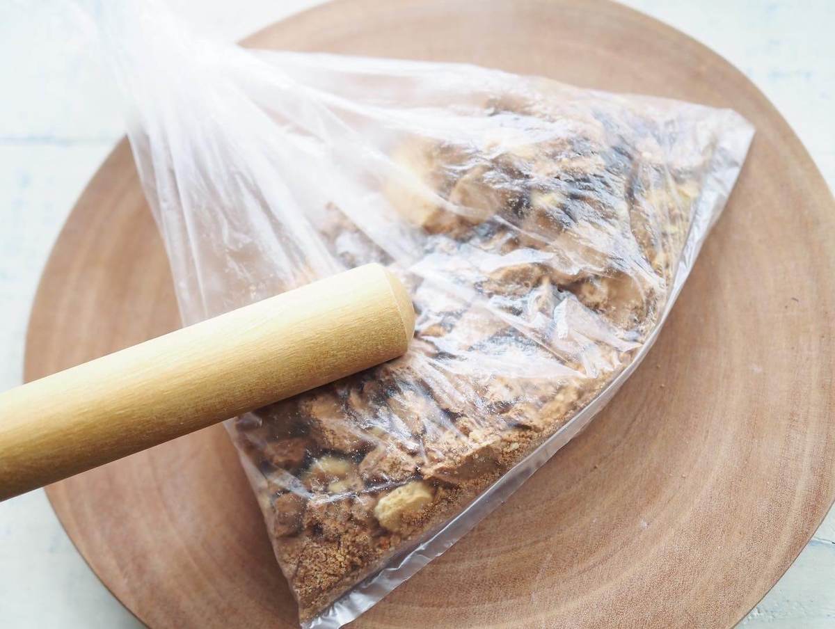 (2)袋にビスケットを入れて、めん棒などで細かく砕き、バターを入れてよく揉み全体になじませる。