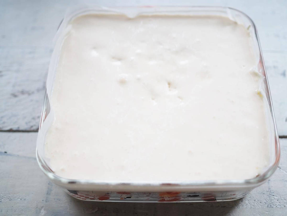 (3)クッキングシートを敷いた型にラップを使って②を敷き詰めて底生地を作る。