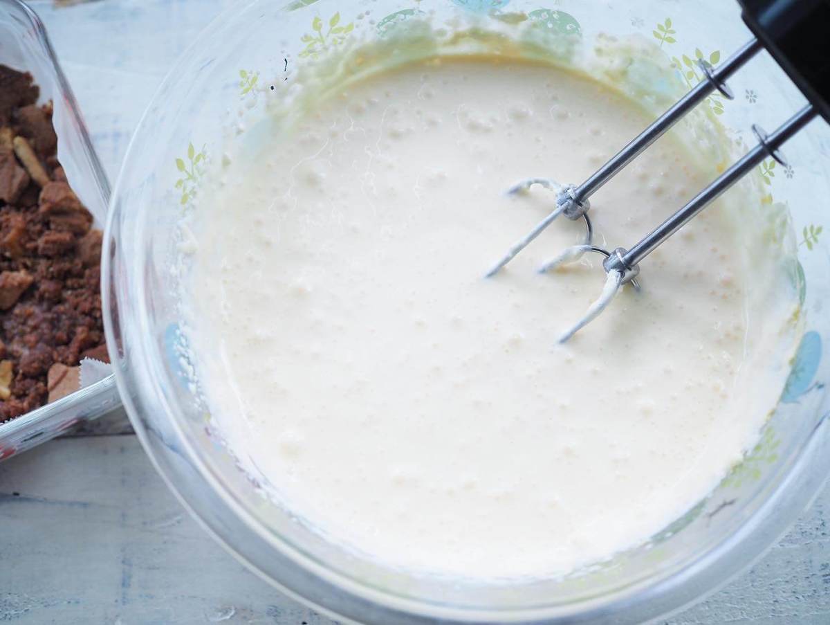 (2)卵・生クリームを加えて、”もったり”するまでよく混ぜる。