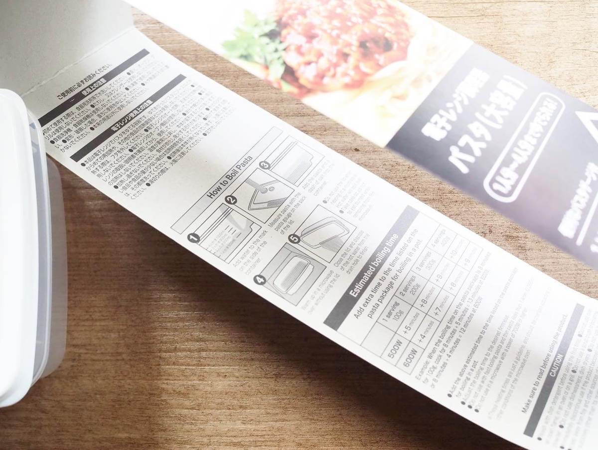 蓋の部分には加熱時間の目安が書かれているので、パッケージを捨ててしまっても大丈夫な安心仕様です。