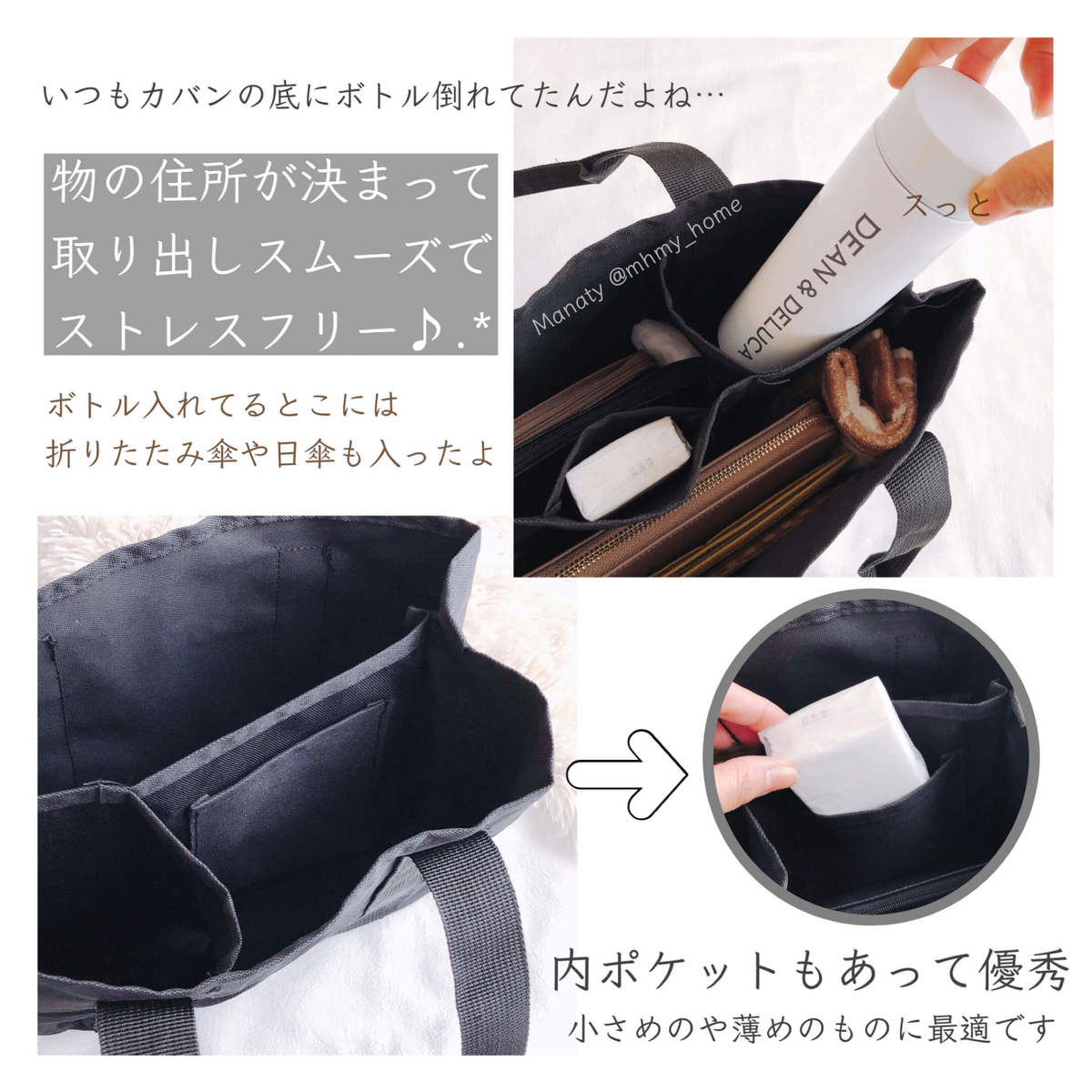 物の住所が決まって、取り出しもスムーズでストレスフリーに♪いつもカバンの底に倒れてたボトルも、これなら倒れません。感動!