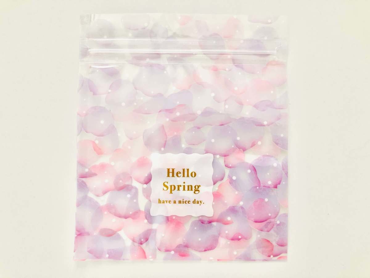 フロスト手提バッグとお揃いの側が可愛い「ジップバッグ ペタル 110円(税込)」もあります!こちらも淡い色合いがとっても美しいアイテムです♪しかも食品を直接入れられるので、ホワイトデー用のギフトにも使えますよ。