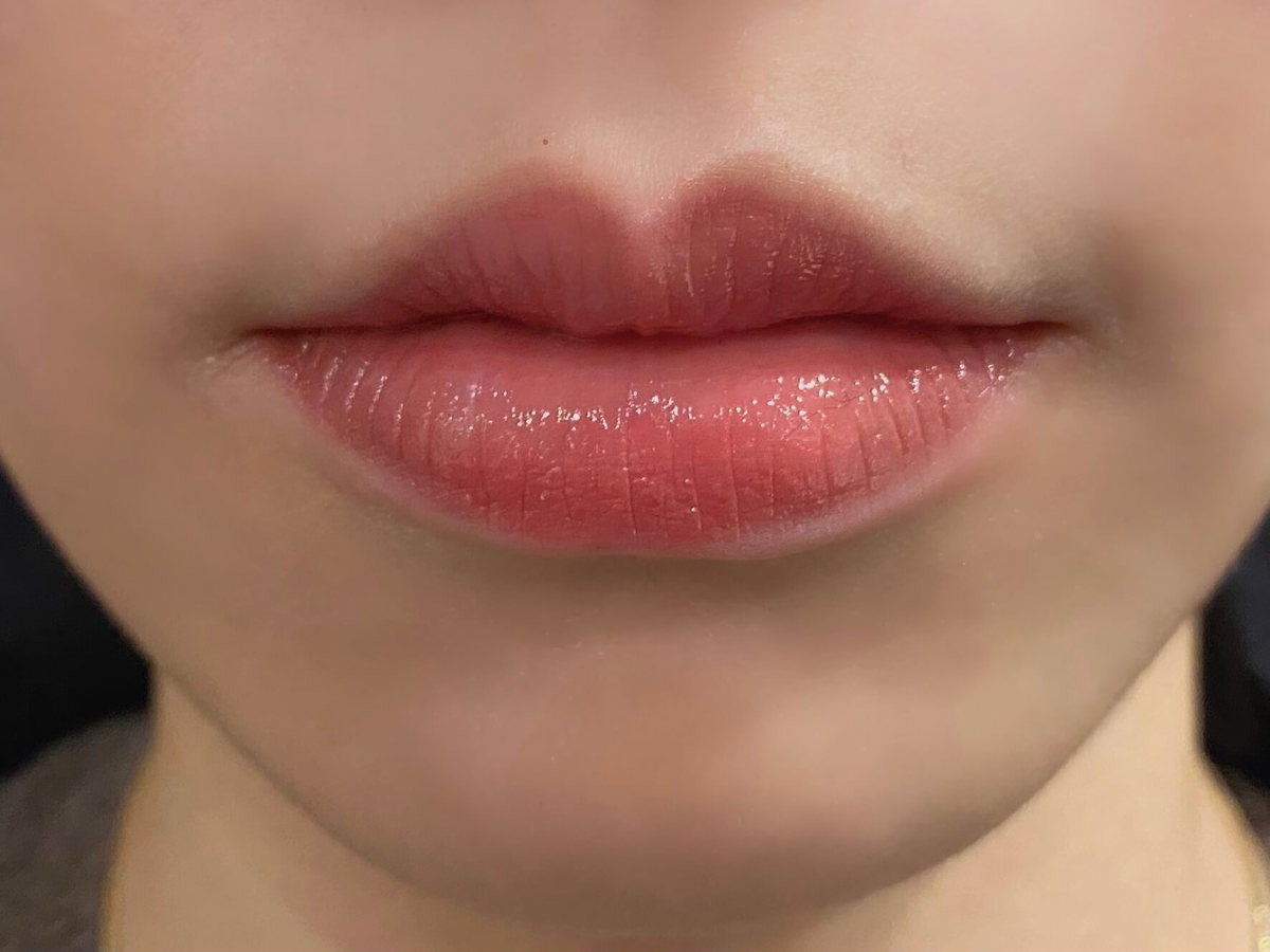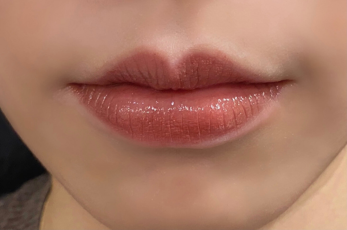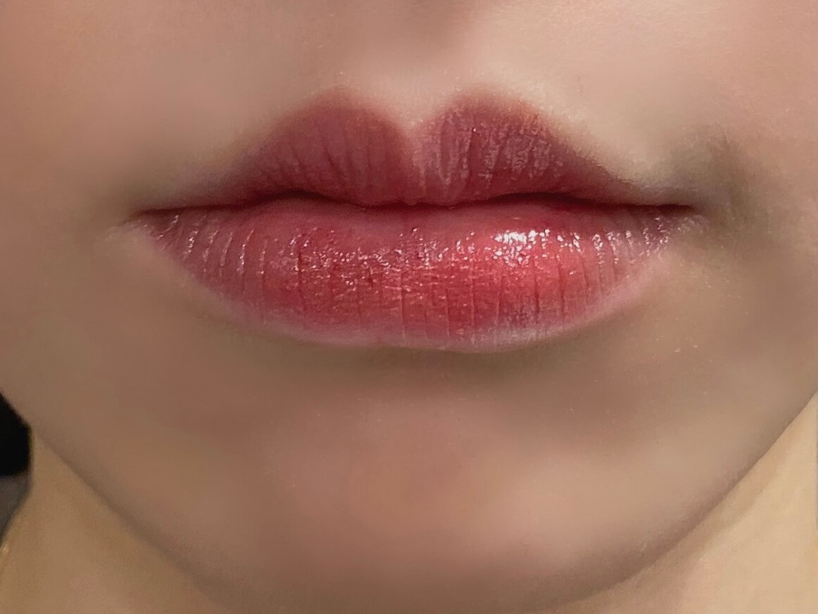 実際に唇につけてみました。重ね塗りしなくても、高発色で塗り立てはツヤっとした質感。時間が経つと、マットな質感になっていきます。