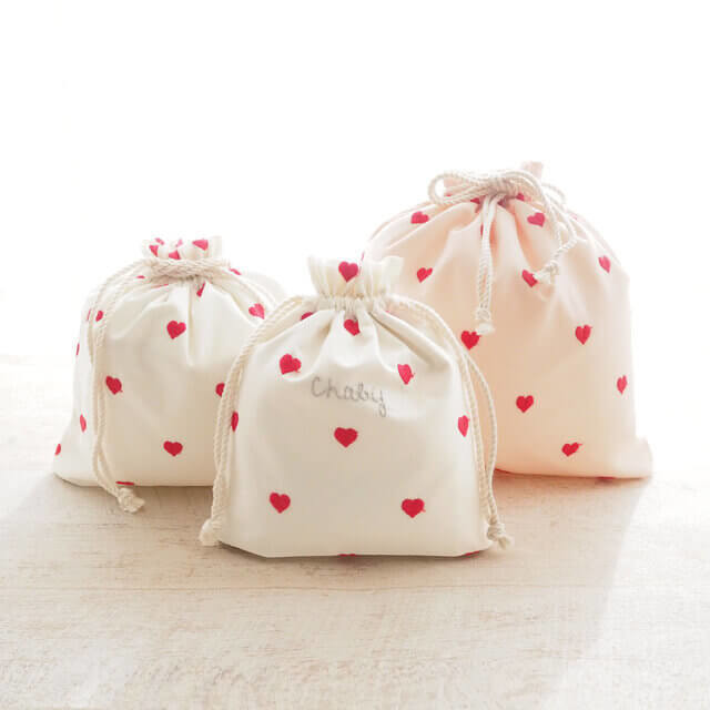 淡色の生地に、真っ赤なぷっくりハートがかわいすぎる「ハートの名入れ巾着袋」。幅広い7サイズ展開で、より女子っぽい淡いピンクカラーも選べます!単品でも、全サイズ揃えても統一感が出ておしゃれで可愛いですよ。